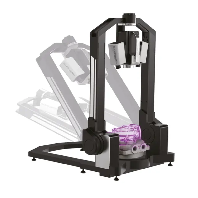 Vylo Raptor 3DX tarama sistemi optiklerin yer aldığı bir tarama ünitesi ve bu ünite ile çalışabilen bir otomatik platformdan oluşur. Bu platform ise 0 - 90° açıları arasında hareket eden bir kol ile taranacak parçaların yerleştirildiği 360° dairesel hareket eden bir tabladan meydana gelir